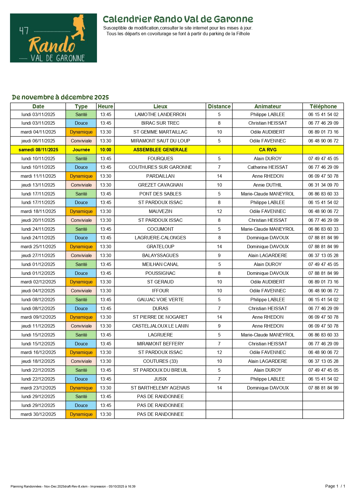 Le calendrier de randonnées de Rando Val de Garonne est maintenant connu pour la fin d’année 2025. Au programme : des randonnées douces, randonnées santé, randonnées conviviales & randonnées dynamiques à travers le territoire !